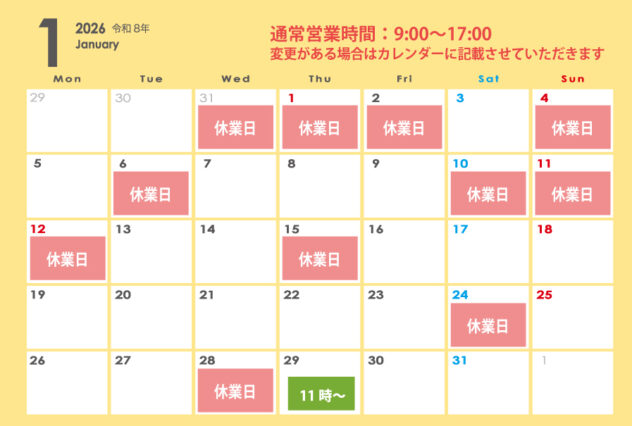 【1月の営業日カレンダー】