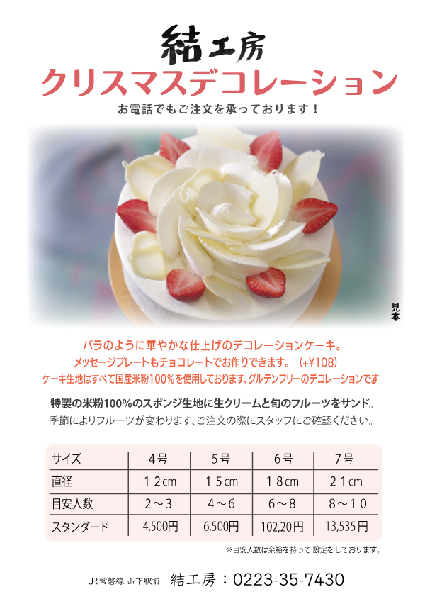 結工房の季節のデコレーションは、グルテンフリー&純生クリーム使用&自家製スポンジのデコレーションケーキです。