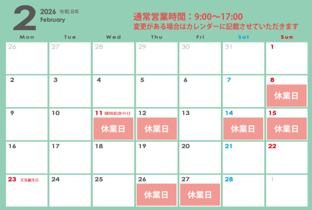 【2月の営業日カレンダー】